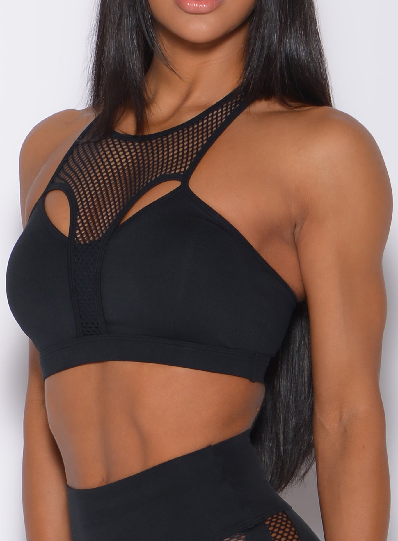 Why be vanilla when you can be extra? We’re going wild for this glamorous mesh sports bra. and you will too. With party-girl vibes and fierce mesh detailing. this sports bra is reimagining the definition of sportswear. The cut-out design. mesh racer detailing and slinky sheen finish will have you all fired up to smash your personal record in the gym. And the best part? It’s as reliable as it is sassy. meaning you get all the support and comfort you need. while causing a stir in the gym and beyond. Wear yours solo for lift motivation. with the matching Mohawk Leggings for double the drama. or under a blazer for edgy evening style.