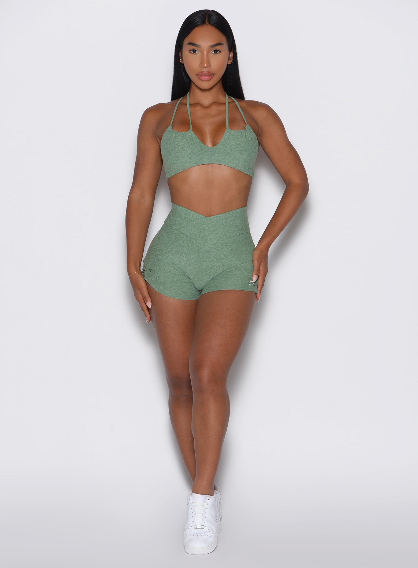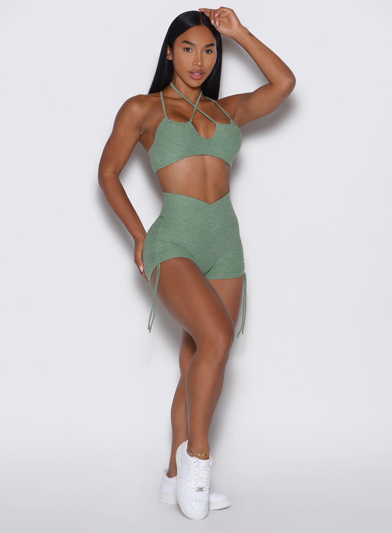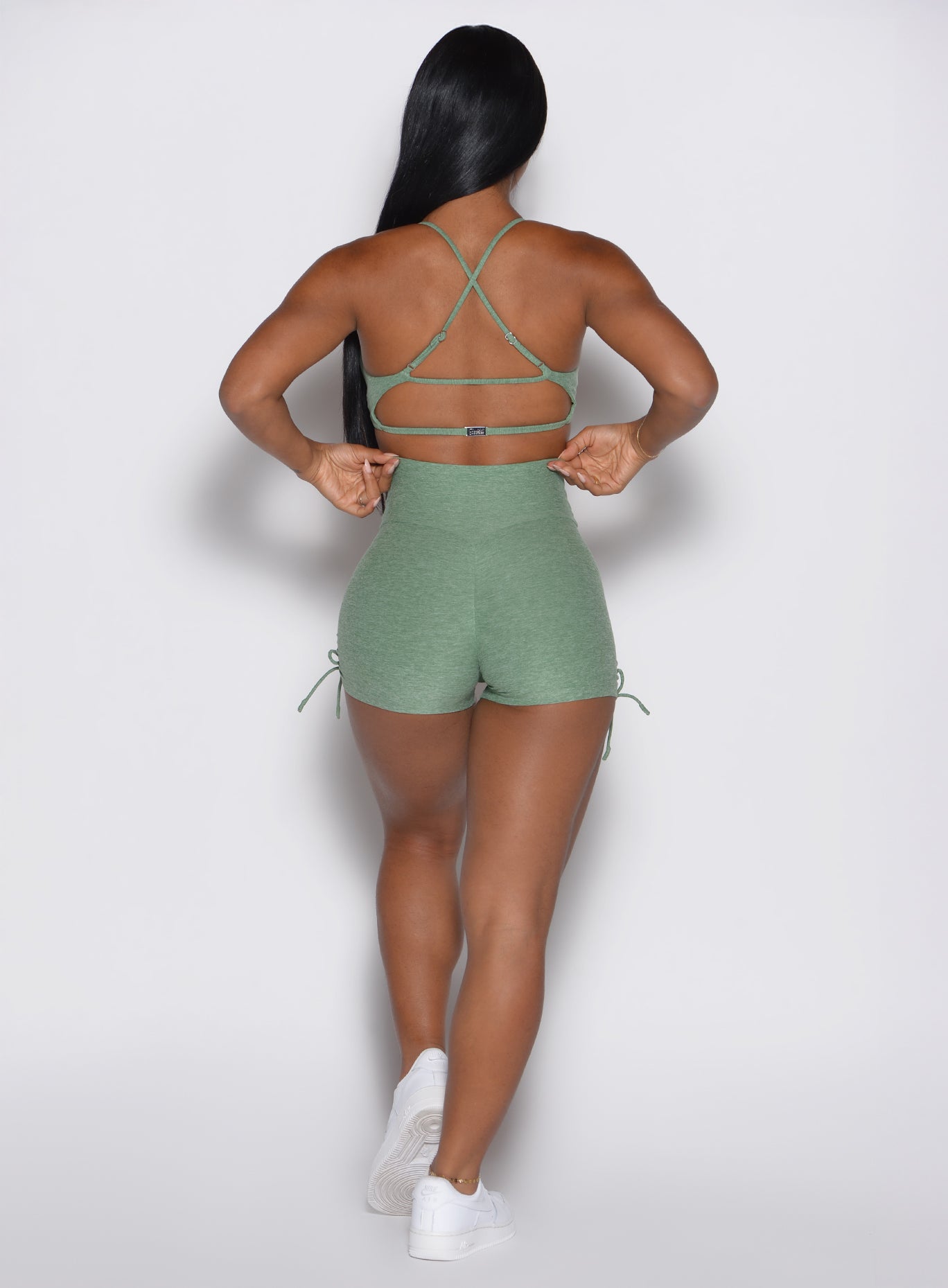 The Tiny Waist Tie Shorts in Basil are a standout piece from the Tied & True Collection. Designed as green gym shorts with a sleek. supportive feel. they feature a flattering high-rise and functional tie detail. These tiny waist shorts contour comfortably while allowing full mobility. making them ideal for training or everyday wear. A performance essential with Bombshell Sportswear’s signature fit.